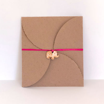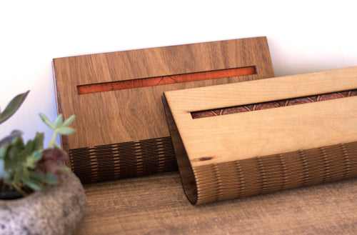 Beautiful recycled-cardboard gift wrap keeps your clutch secure while traveling